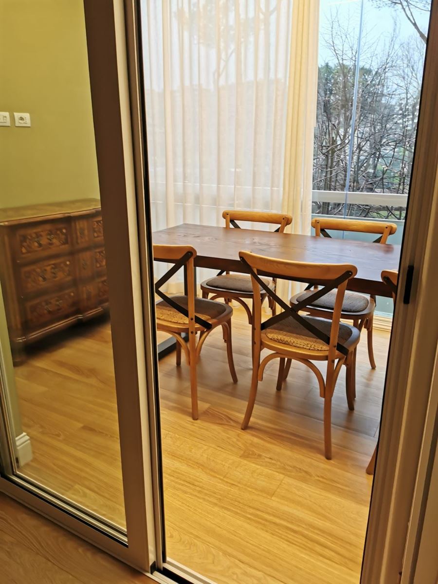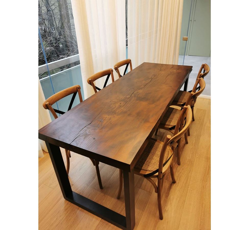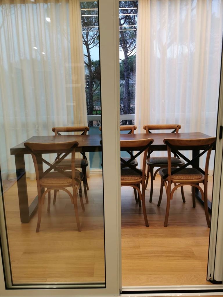 Ciò che ha reso realizzabile questo progetto è stata la possibilità di dividere il balcone in due, una parte aperta e una parte chiusa, riuscendo così a creare un angolo perfetto per il tavolo da pranzo, ottenuto da vecchie travi ripulite e gambe in ferro, le sedie sono di maison du monde e la cassettiera è stata recuperata da una vecchia ristrutturazione, la proprietaria stava per buttarla, così ci siamo offerti di ospitarla, insieme ai comodini in questa nuova casa.