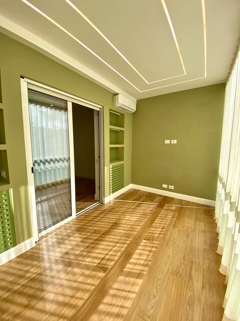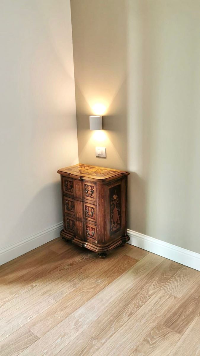 Incasso a terra per gli infissi, sostituzione del vetro della ringhiera del balcone con uno nuovo, aria condizionata, angolo lavanderia sul balcone con un punto acqua decorato da una vasca in pietra e rubinetto ottone dall’aspetto retrò
