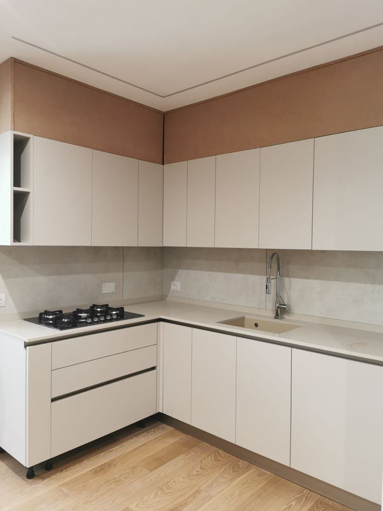 La cucina in beige chiaro ospita tutto il necessario, frigo, forno alto, lavastoviglie, fuochi da 70 cm, vasca sottotop in fragranite da 60 cm, la parte superiore realizzata successivamente ma con lo stesso identico colore della cucina ha raddoppiato lo spazio utile. Un divano ad L bianco e una parete tv sospesa, su misura, con sportelli e cassetti in legno illuminata a led completano lo spazio.