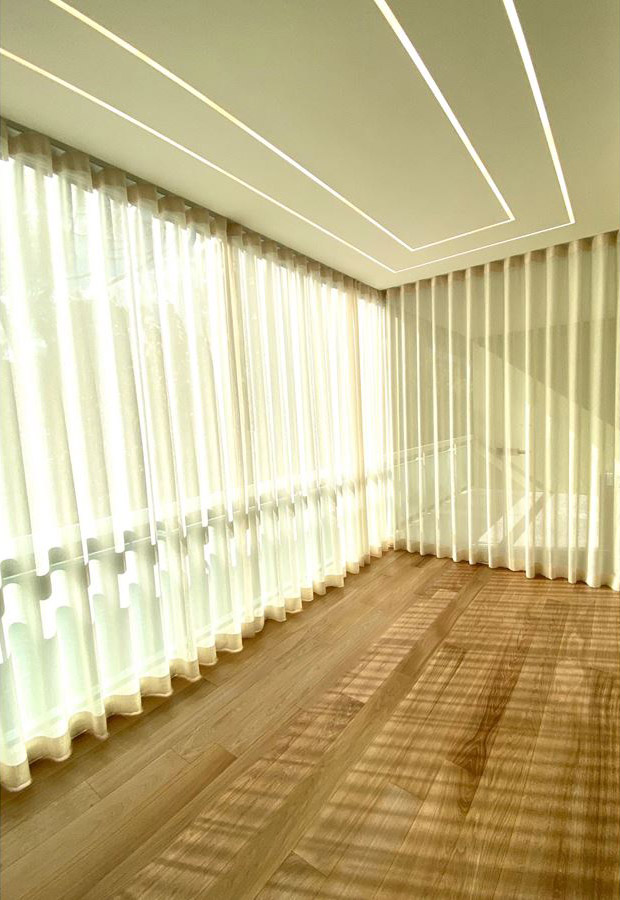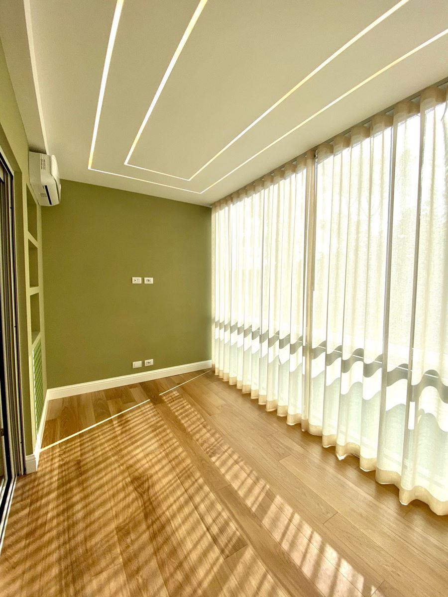 Il balcone ha una vetrata scorrevole che lo rende chiuso o completamente aperto in base alla necessità, la tenda oltre a difendere dal sole può scorrere e diffondere la luce in maniera diversa in base alle ore del giorno, ciò che ho amato di più è stato il controsoffitto di pochi millimetri sul balcone, il minimo necessario per inserire il led ad incasso, questo dettaglio ha reso lo spazio completo, distaccandosi completamente dal concetto di balcone.