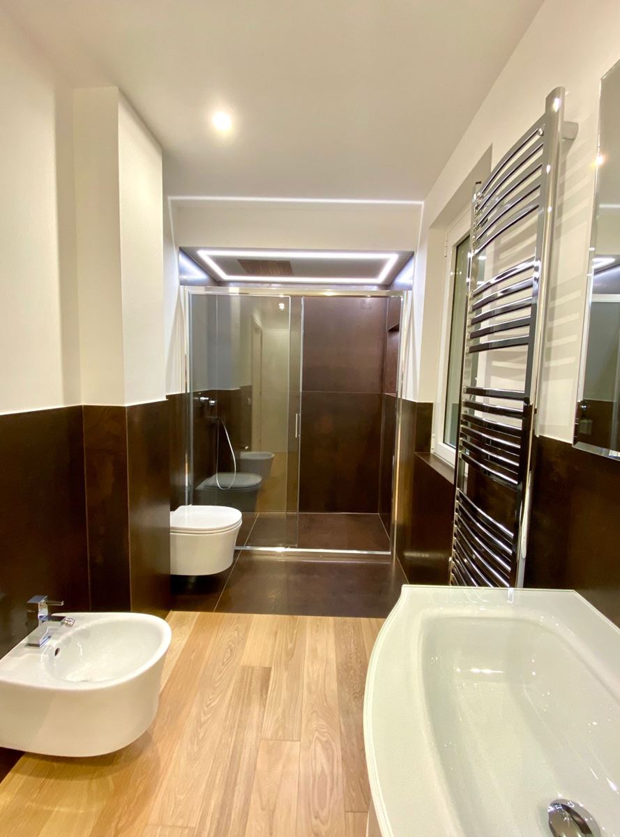 Il bagno è stato rivestito in gres effetto corten, la doccia 80x160cm è a mio parere la chicca di questo ambiente, il controsoffitto ospita il soffione ad incasso ed un led perimetrale, interna a l box non può mancare una nicchia per i prodotti. Il piatto doccia stesso è stato ottenuto dalla mattonella in gres che proseguendo al di fuori della doccia evita che si bagni il parquet.