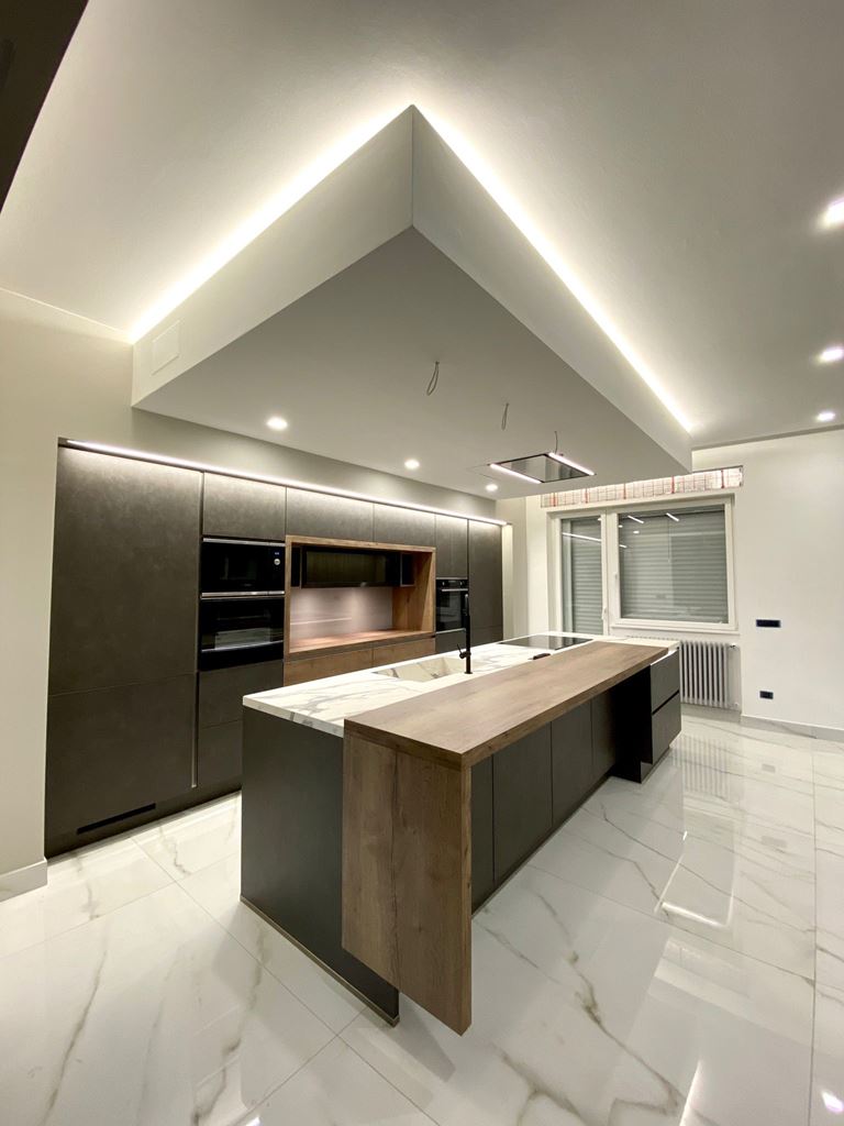 Procedendo troviamo il nucleo di questo appartamento un grande salone open space caratterizzato da un’enorme parete attrezzata che ospita tv, camino elettrico e nicchie laterali illuminate, il divano angolare precede l’enorme isola scura impreziosita da un top in HPL calacatta.