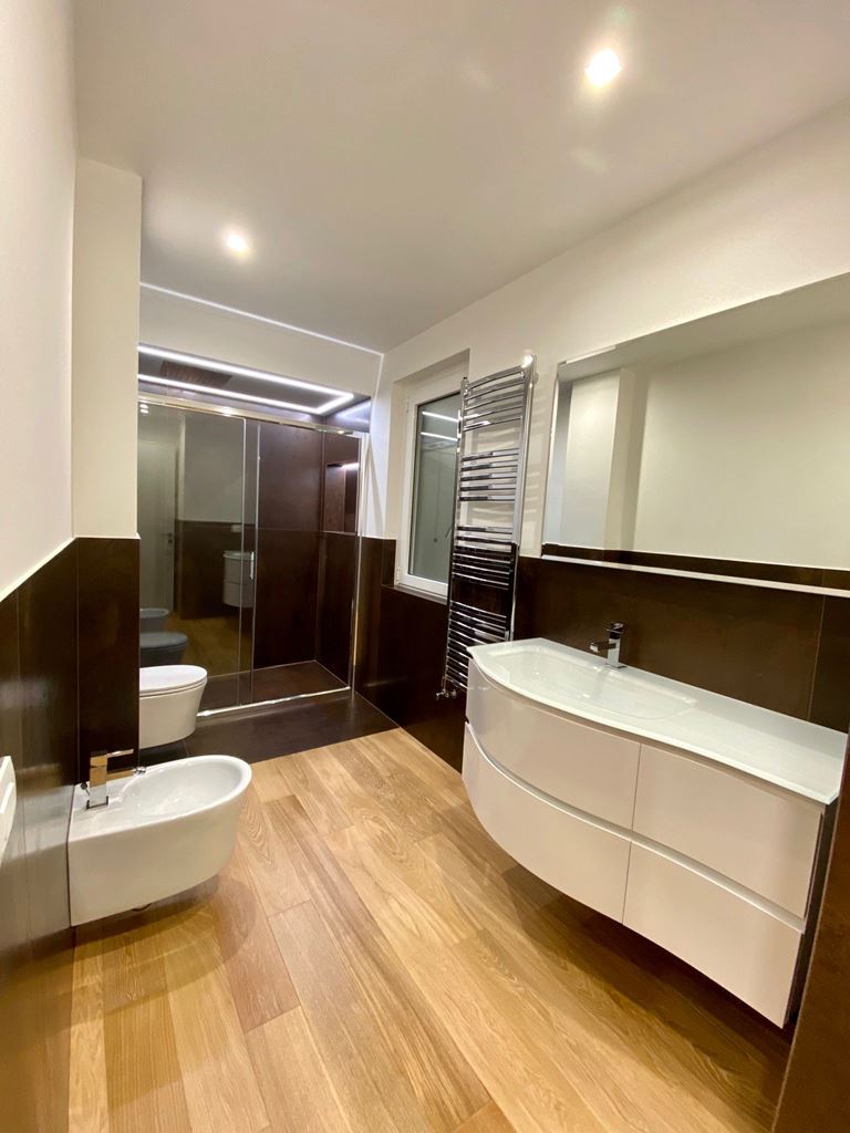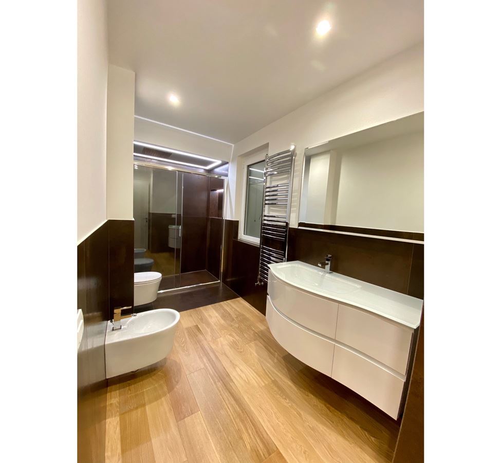 Il bagno è stato rivestito in gres effetto corten, la doccia 80x160cm è a mio parere la chicca di questo ambiente, il controsoffitto ospita il soffione ad incasso ed un led perimetrale, interna a l box non può mancare una nicchia per i prodotti. Il piatto doccia stesso è stato ottenuto dalla mattonella in gres che proseguendo al di fuori della doccia evita che si bagni il parquet.