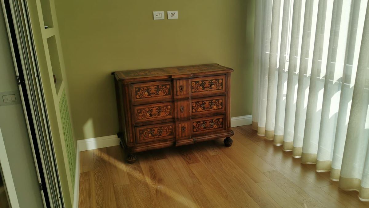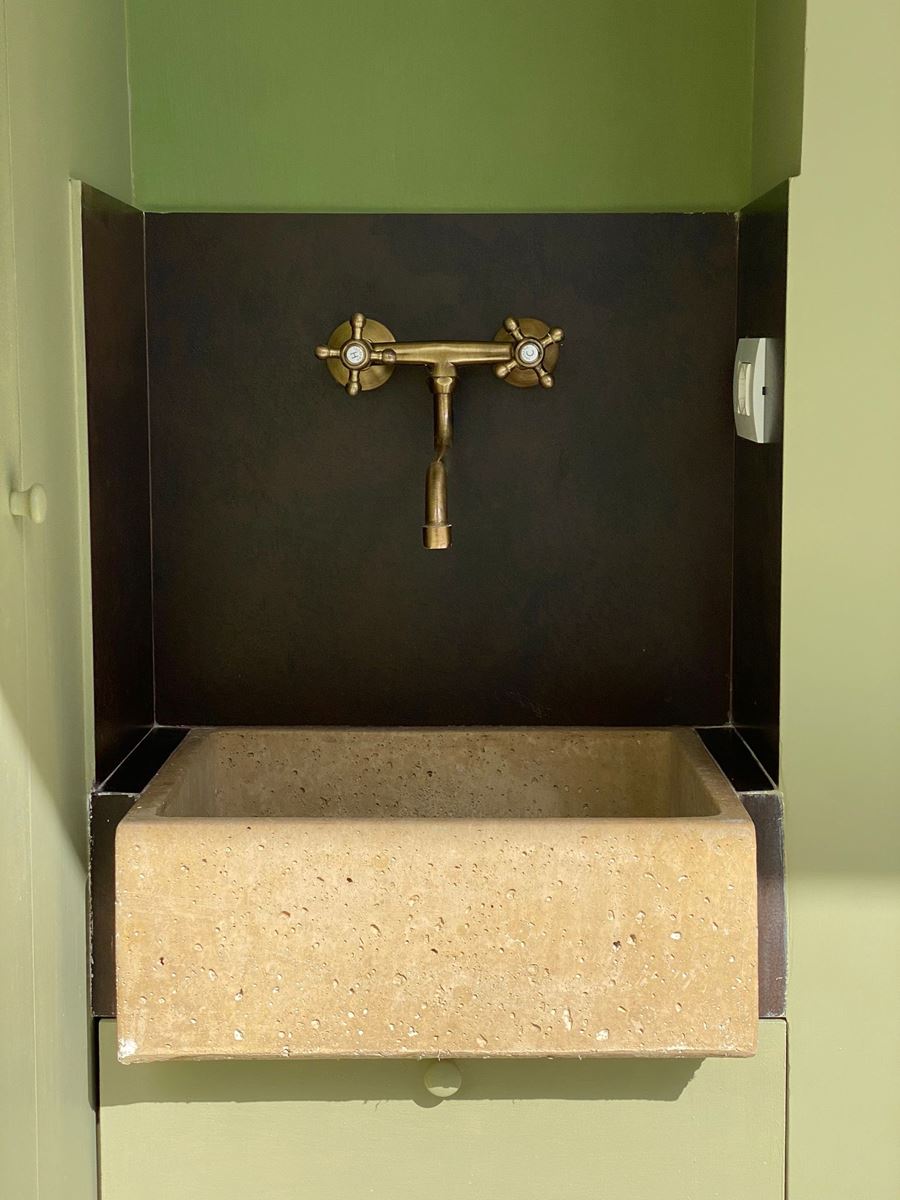 Incasso a terra per gli infissi, sostituzione del vetro della ringhiera del balcone con uno nuovo, aria condizionata, angolo lavanderia sul balcone con un punto acqua decorato da una vasca in pietra e rubinetto ottone dall’aspetto retrò