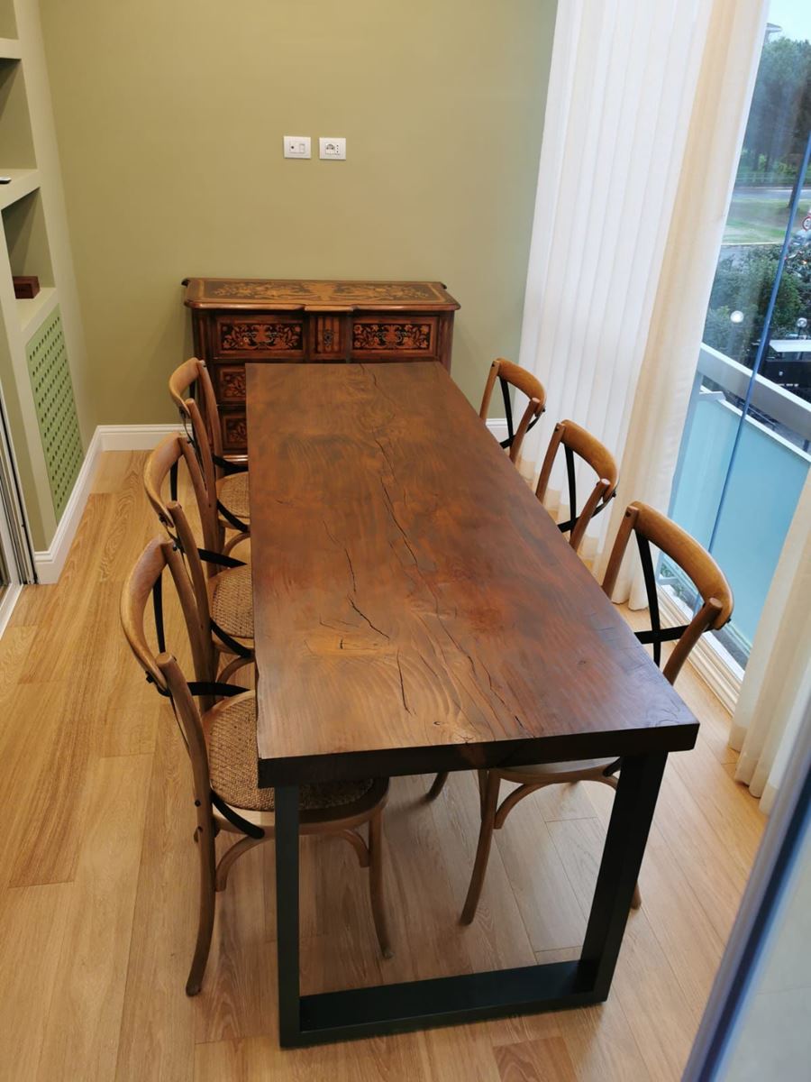 Ciò che ha reso realizzabile questo progetto è stata la possibilità di dividere il balcone in due, una parte aperta e una parte chiusa, riuscendo così a creare un angolo perfetto per il tavolo da pranzo, ottenuto da vecchie travi ripulite e gambe in ferro, le sedie sono di maison du monde e la cassettiera è stata recuperata da una vecchia ristrutturazione, la proprietaria stava per buttarla, così ci siamo offerti di ospitarla, insieme ai comodini in questa nuova casa.