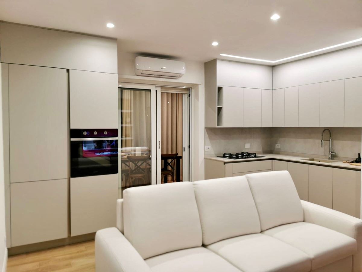 La cucina in beige chiaro ospita tutto il necessario, frigo, forno alto, lavastoviglie, fuochi da 70 cm, vasca sottotop in fragranite da 60 cm, la parte superiore realizzata successivamente ma con lo stesso identico colore della cucina ha raddoppiato lo spazio utile. Un divano ad L bianco e una parete tv sospesa, su misura, con sportelli e cassetti in legno illuminata a led completano lo spazio.