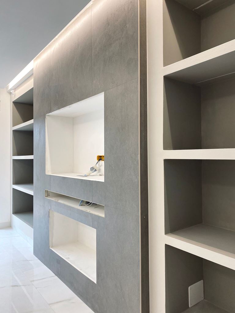 L’appartamento era composto da due abitazioni tipiche degli anni 60 unite senza un vero progetto, corridoi lunghi, bagni scomodi posizionati a caso, camere giganti e minuscole senza alcun senso, salone piccolo e cucina separata, l’unica soluzione è stata quindi demolire ogni tramezzo e sviluppare da zero impianti, suddivisione interna, controsoffitti e materiali.