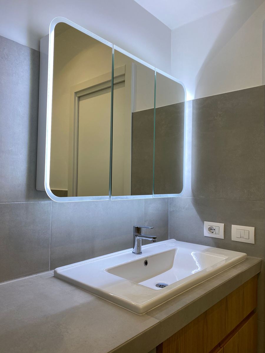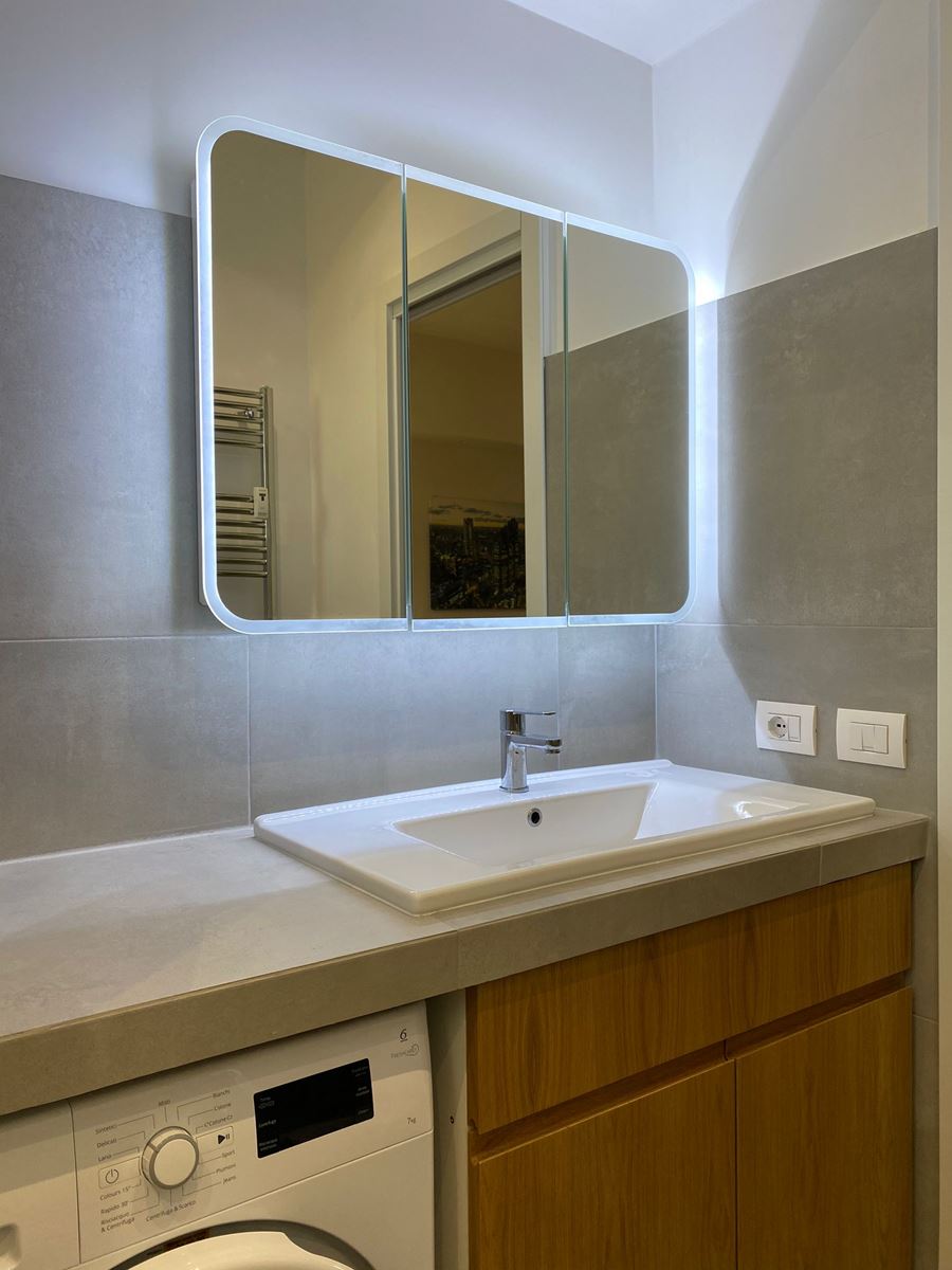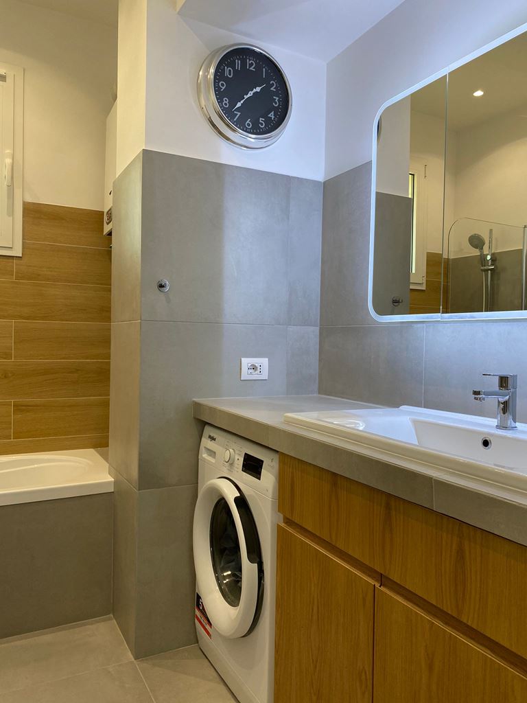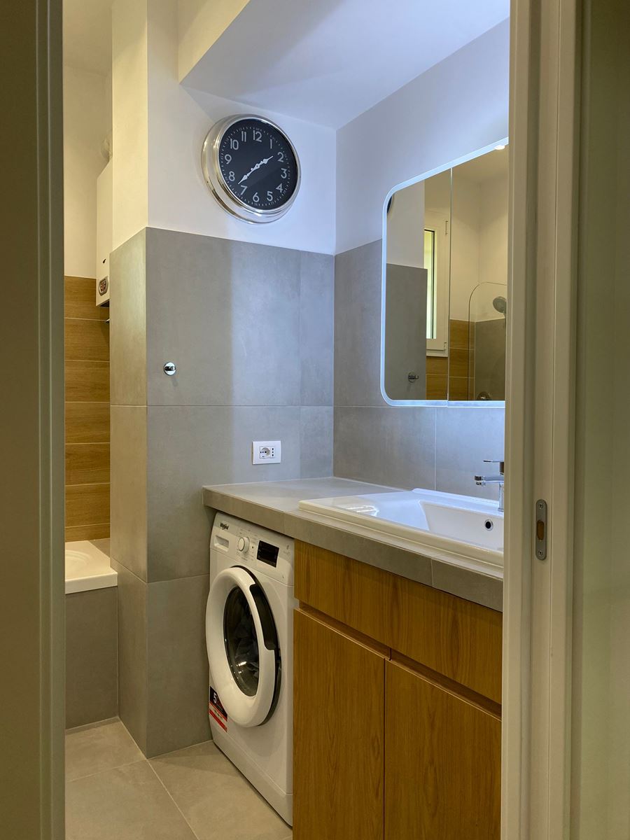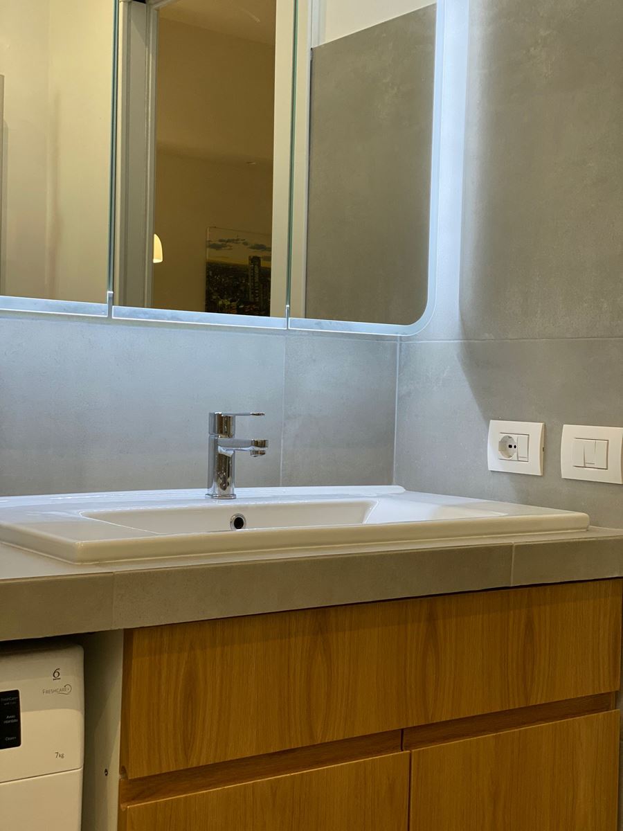 Dovendo rifare tutto il bagno abbiamo deciso di spostare anche se di poco (10 cm) sia il tramezzo che divideva la cucina dal bagno, che quello che divideva il bagno dalla camera da letto, ci ha permesso di incassare le colonne della cucina che prima risultavano invadere l’ambiente lasciando quindi il giusto passaggio e incassare perfettamente il mobile lavabo portandolo anche alla giusta distanza con i sanitari.