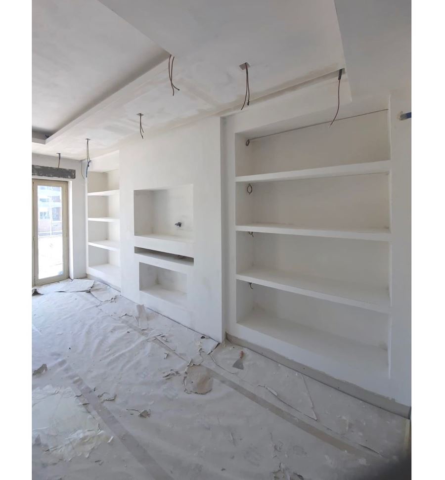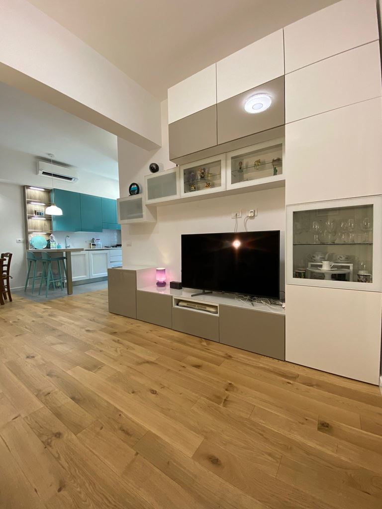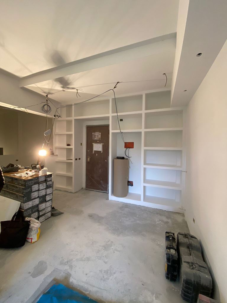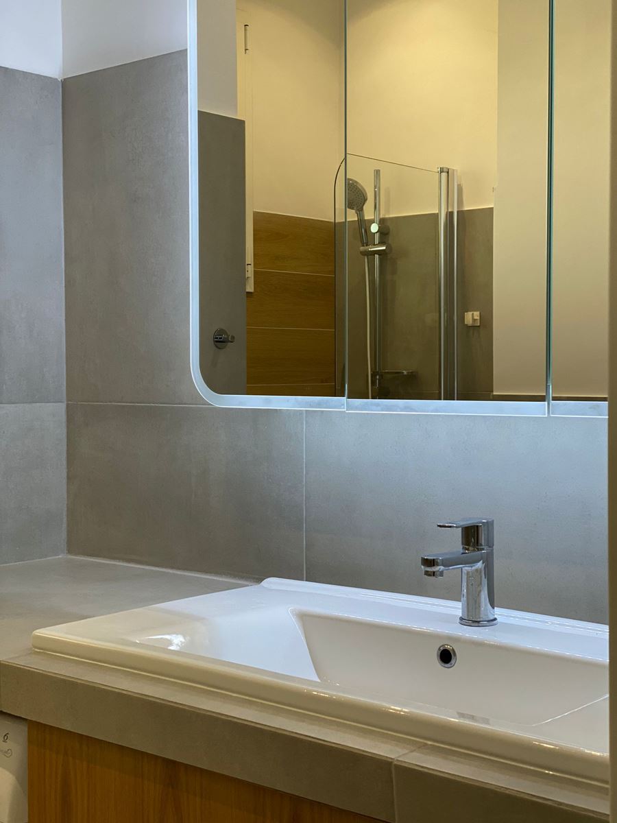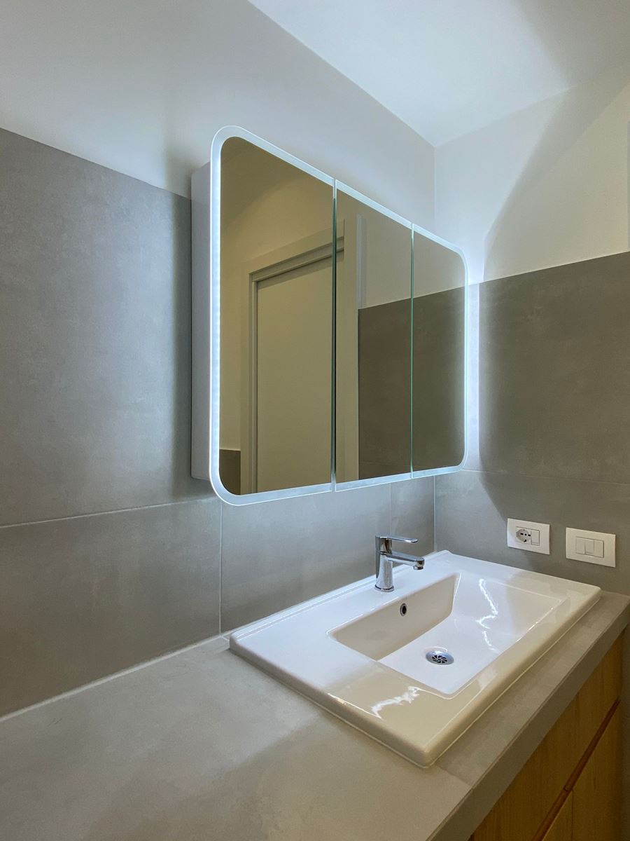 Dovendo rifare tutto il bagno abbiamo deciso di spostare anche se di poco (10 cm) sia il tramezzo che divideva la cucina dal bagno, che quello che divideva il bagno dalla camera da letto, ci ha permesso di incassare le colonne della cucina che prima risultavano invadere l’ambiente lasciando quindi il giusto passaggio e incassare perfettamente il mobile lavabo portandolo anche alla giusta distanza con i sanitari.