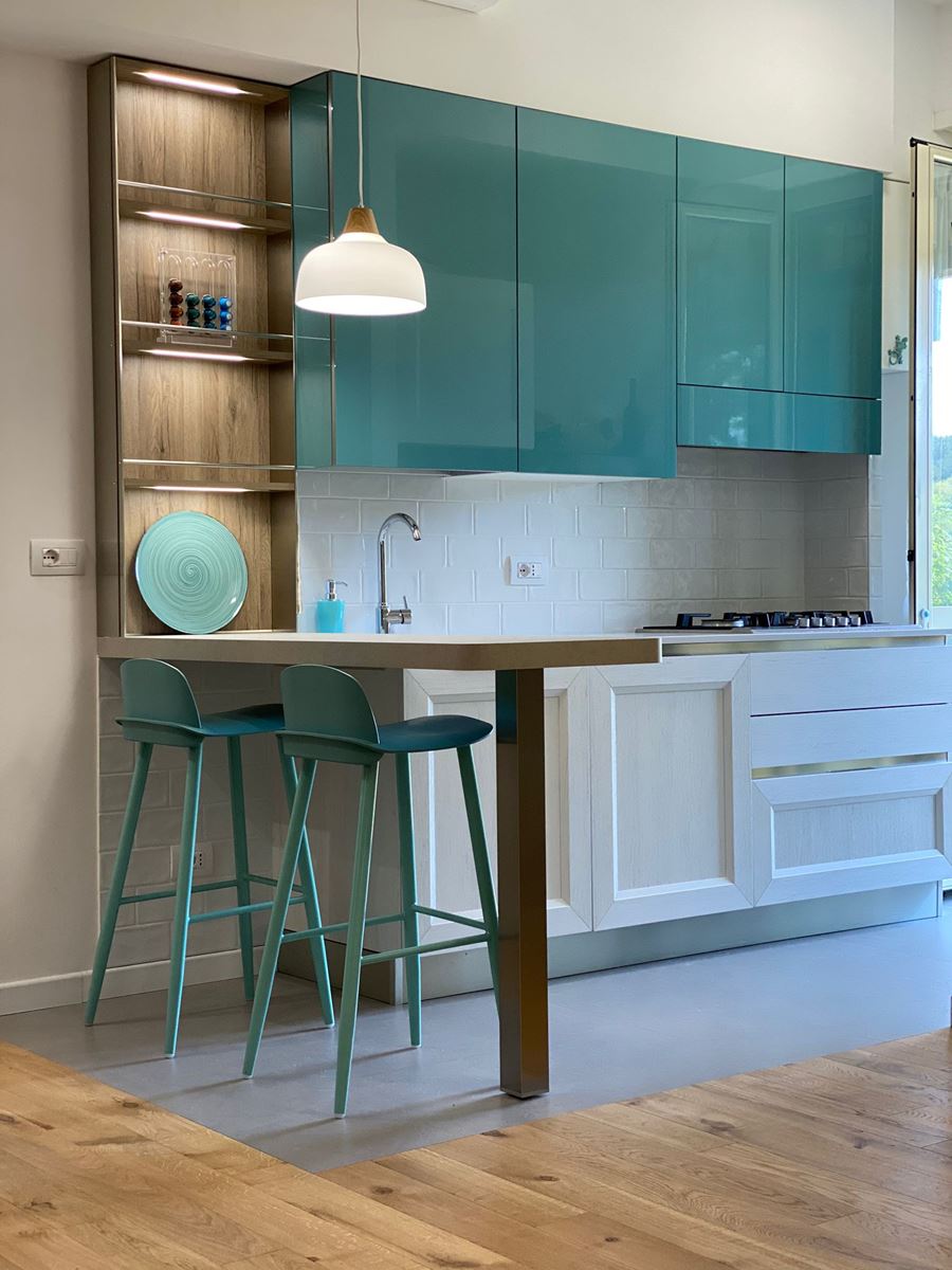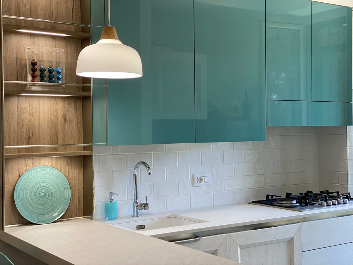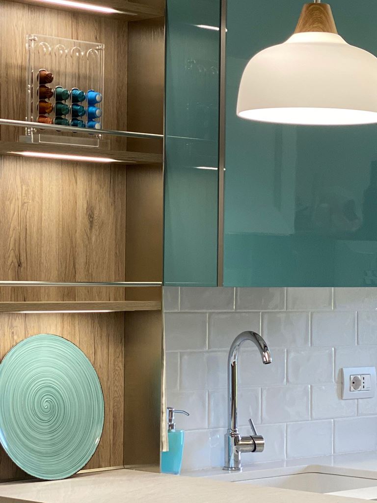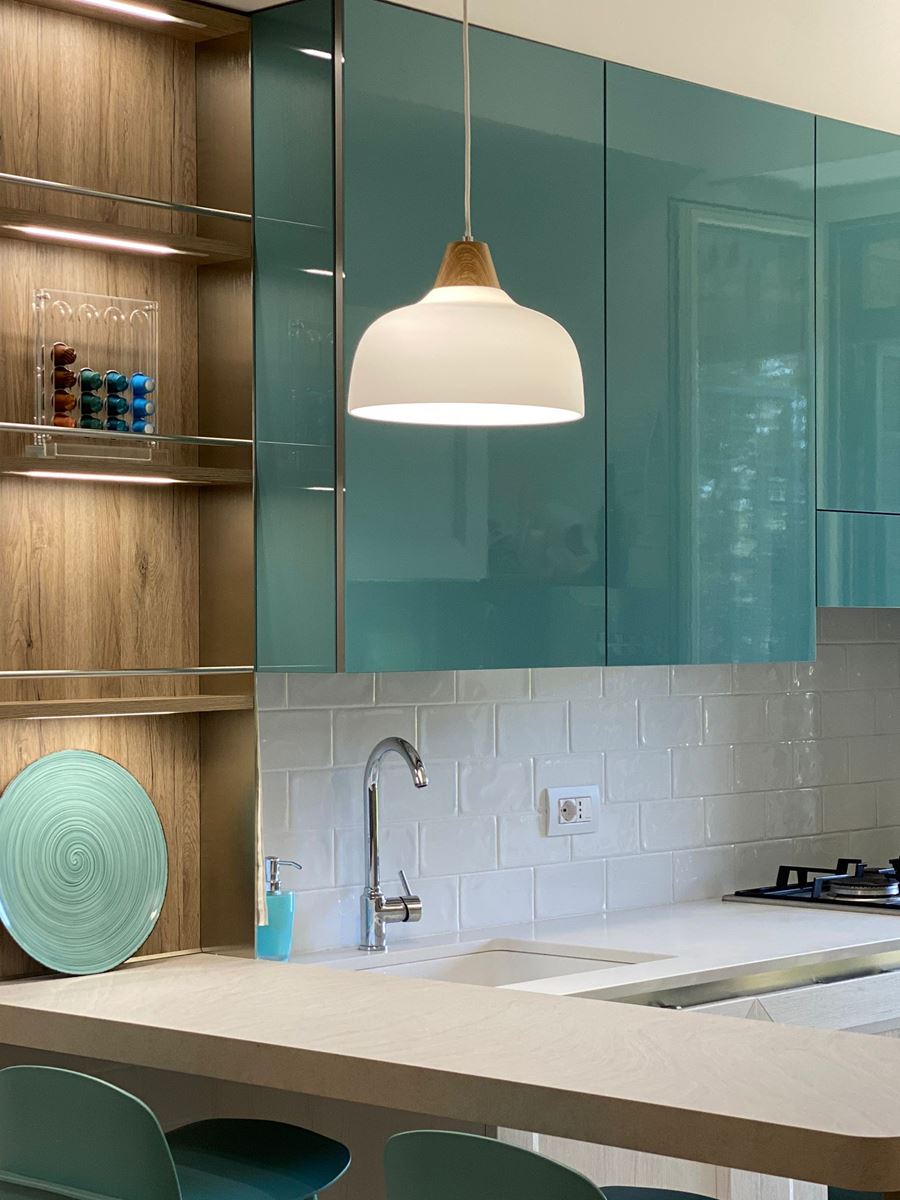 I materiali della cucina superfici lucide, il verde per darle un po’ di carattere ed il legno scaldare l’atmosfera.