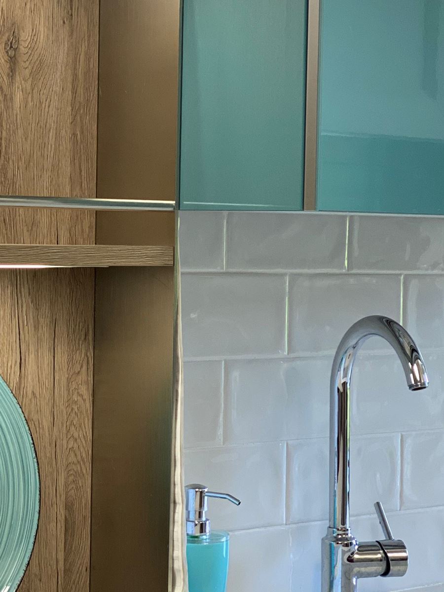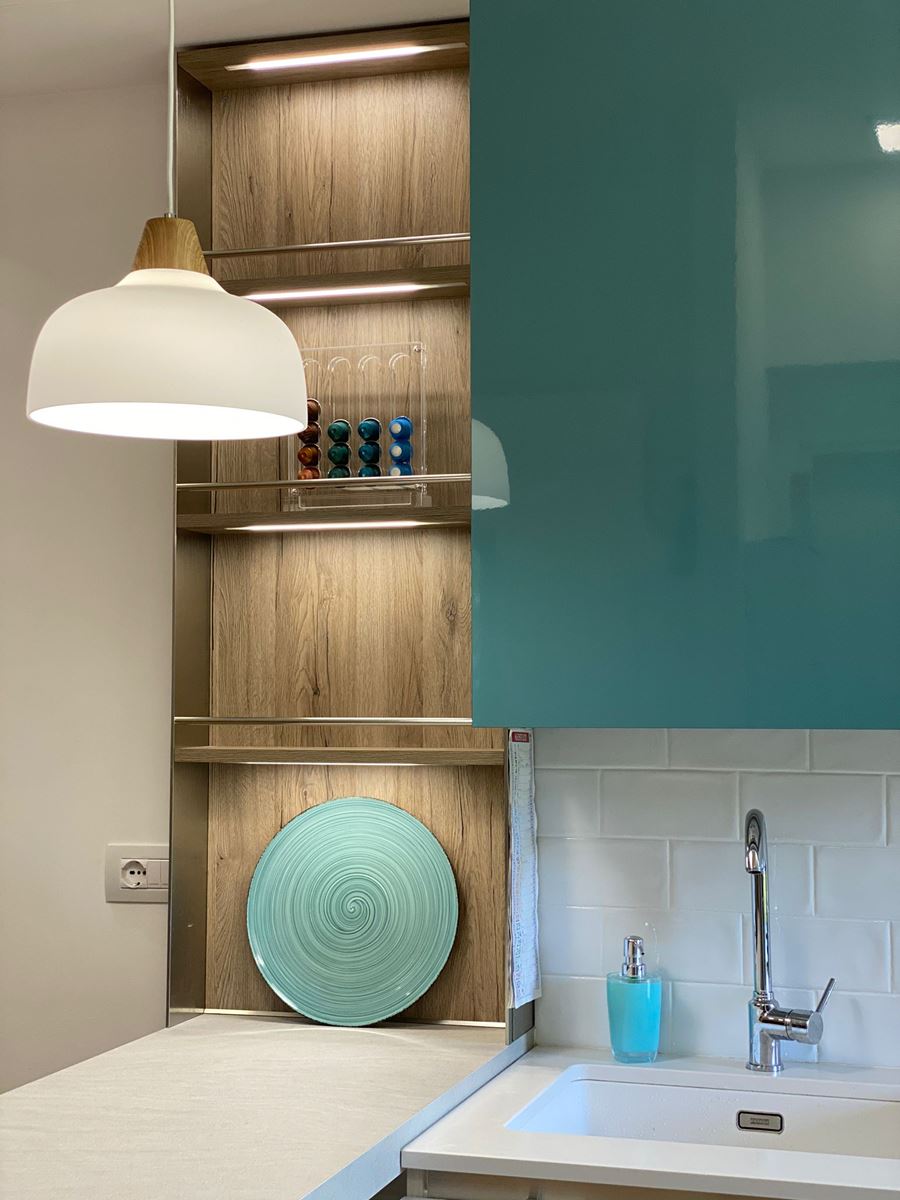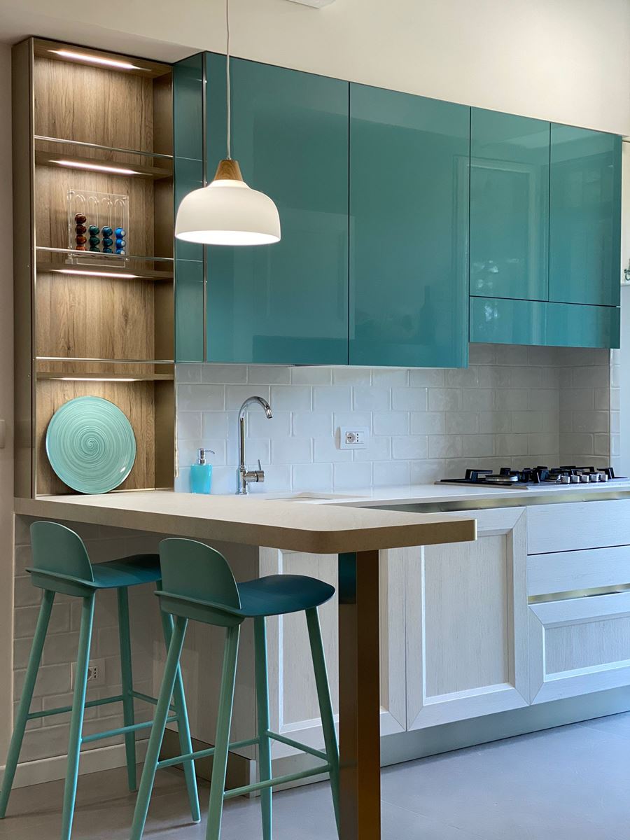 I materiali della cucina superfici lucide, il verde per darle un po’ di carattere ed il legno scaldare l’atmosfera.