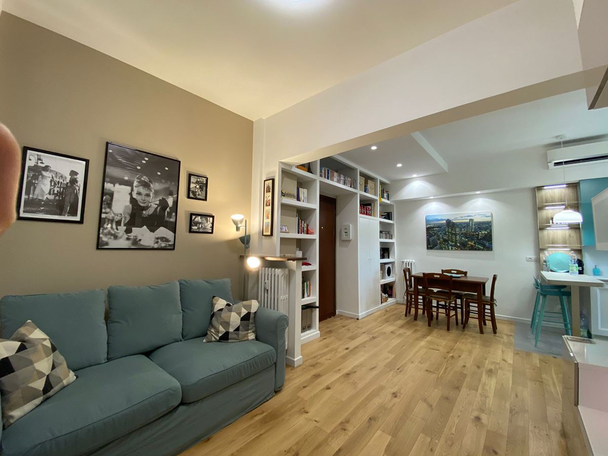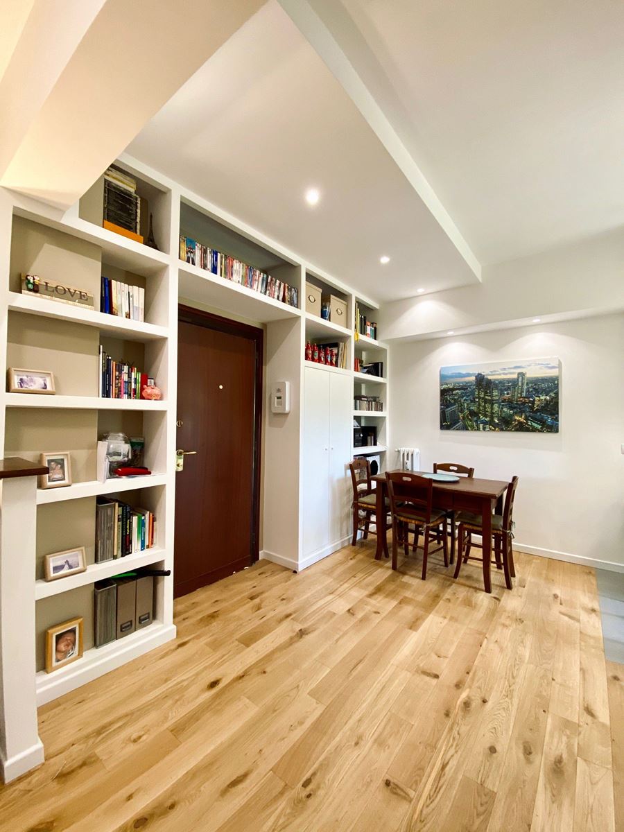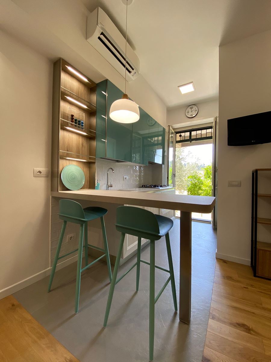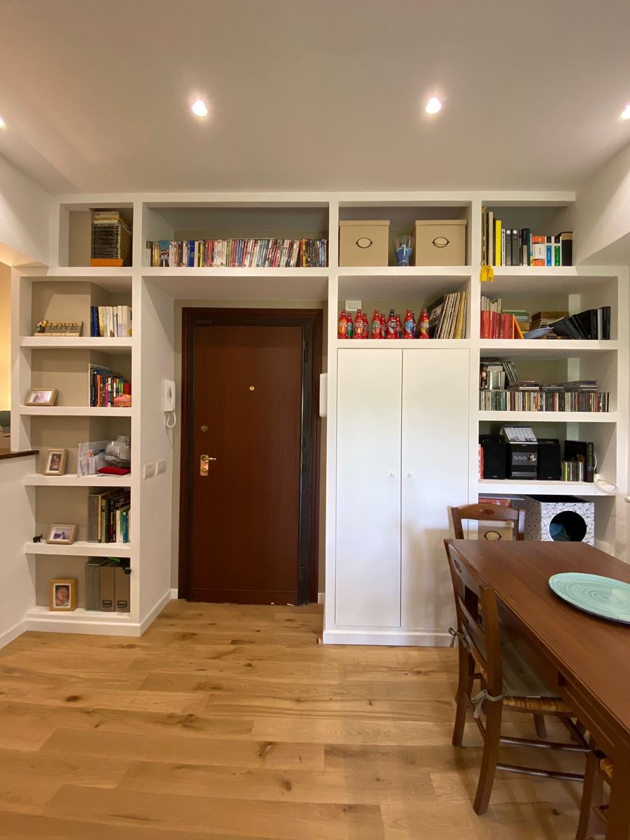 Eliminare lo sgabuzzino all’ingresso, ci ha permesso di spostare il tavolo, ampliare la cucina, ricavare spazio, una graziosa penisola e quindi piano di appoggio .